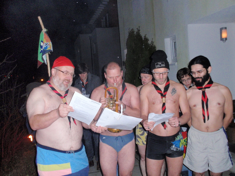 Gesagt getan, neben der Stammesführung erklärten sich auch die restlichen Mitarbeiter dafür bereit, bei der Aktion als Rückendeckung mitzuwirken. So trafen sich alle am Heilig Abend bei bruba vor dem Tore und sangen alle Strophen des gewünschten Liedes in Badehose und Halstuch und sogar mit Trompeten- und Gitarrenbegleitung. Das Wetter war ideal für diese Aktion. Bruba und seine Familie bereiteten freundlicherweise noch einen Tschai und Plätzchen vor, so dass nach der Aktion die gewonnene Wette noch gebührend gefeiert wurde.