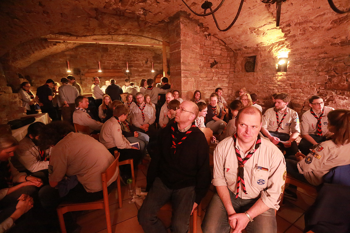 Nach diesen feierlichen Momenten tauchen die BPS-Pfadis in die Welt der Piraten ein. Die Region Süd-Ost hat sich einiges einfallen lassen und lässt die Besatzungen der vier auf dem Burghof ins Leben gerufenen Schiffe in verschiedenen Spielen gegeneinander antreten und um die Gunst der Königin werben. Auch der heiße Tschaj und ein Lagerfeuer dürfen natürlich nicht fehlen, zumal es bei klarem Himmel langsam, aber sicher sehr kühl wird. So ist es kein Wunder, dass es viele nach Ende des Programms nach drinnen in den Gewölbekeller zieht, wo der Abend mit einer zünftigen Singerunde ausklingt.